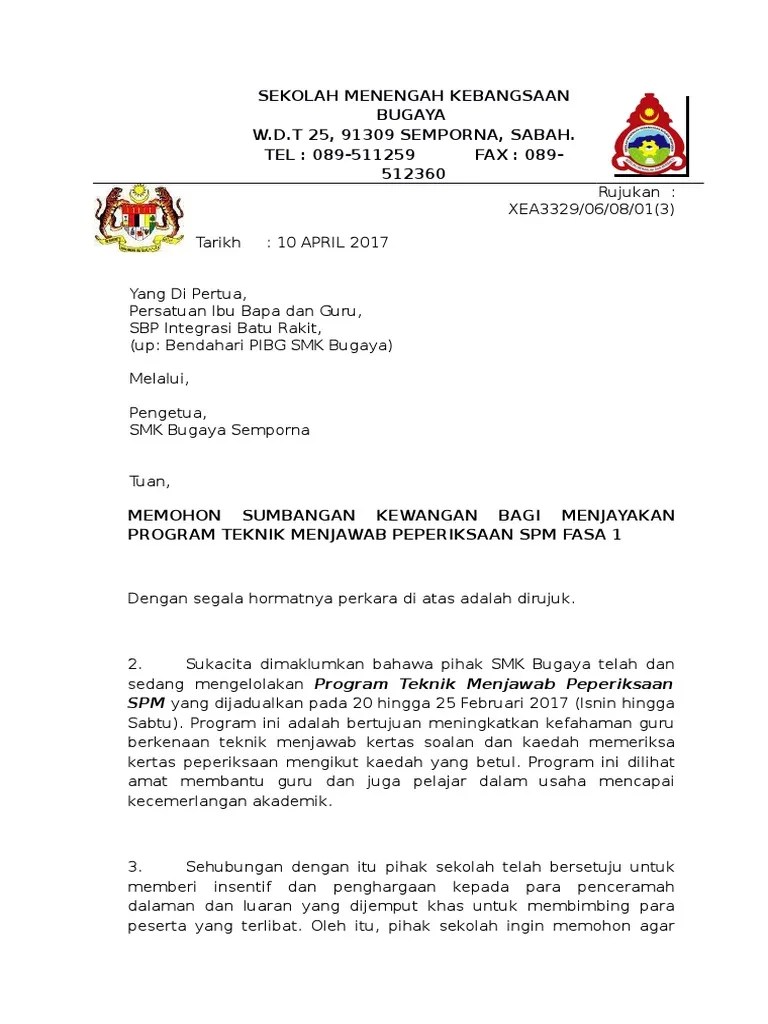 Yang berhormat, memohon sumbangan kewangan sempena lawatan sambil belajar dengan segala hormatnya merujuk perkara di atas. Contoh surat permohonan bantuan dana pembangunan masjid from contohsuratindonesia permohonan untuk memohon sumbangan kewangan untuk aktiviti . Contoh surat mohon sumbangan yb 19.7. Contoh surat permohonan bantuan pendidikan.